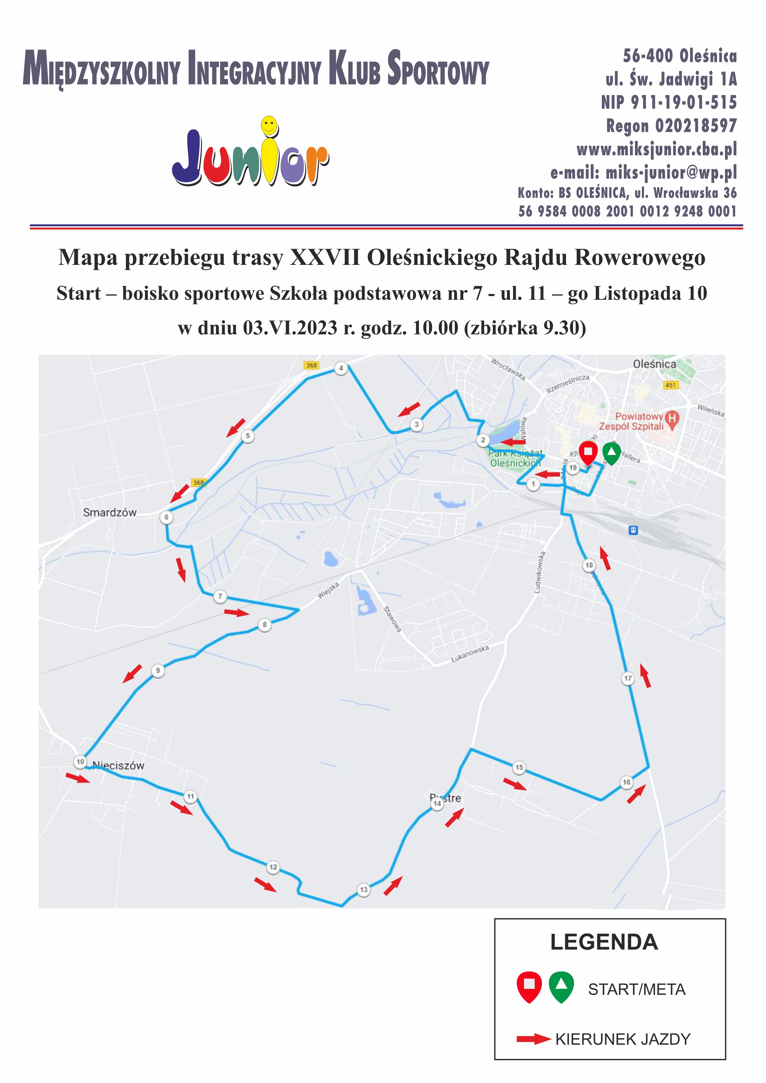 Rajd odbędzie się 03 czerwca 2023 r. Zbiórka Rajdu nastąpi na terenie boiska Szkoły Podstawowej nr 7 w Oleśnicy przy ul. 11-go listopada o godz. 9:30. Start Rajdu o godzinie 10:00, meta znajdować w miejscu startu. Koniec planowany jest około godziny 15:00.