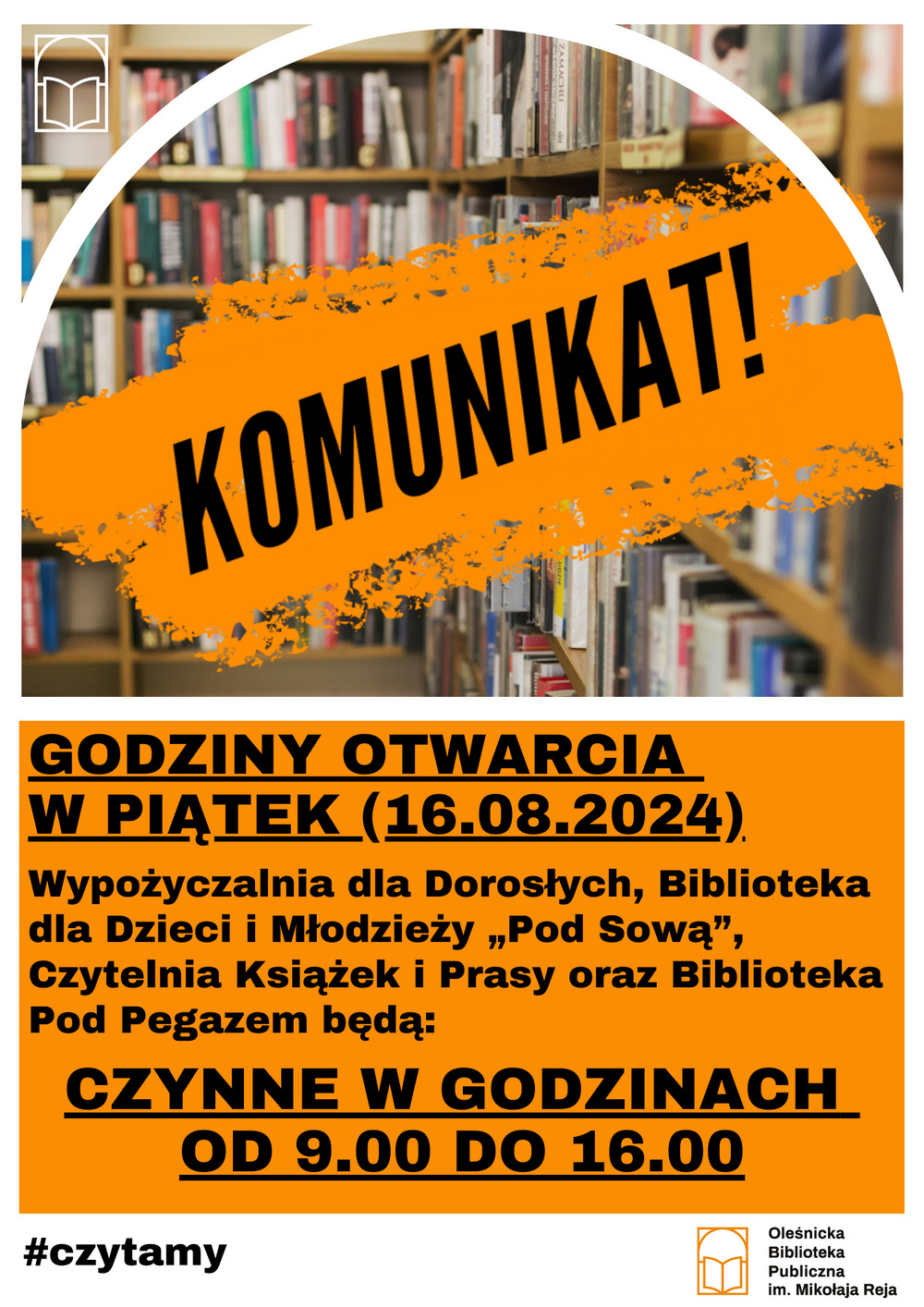 Komunikat w sprawie godzin pracy 16.08 Oleśnickiej Biblioteki Publicznej im. Mikołaja Reja