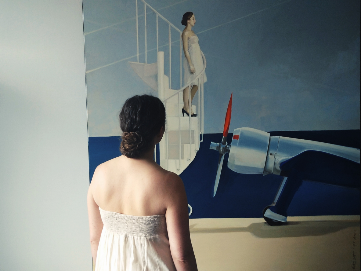 Obraz Marka Okrassy „Białe schody” olej na płótnie 180x160 cm, który pochodzi z kolekcji Państwowej Galerii Sztuki w Sopocie można zobaczyć w oknie Urzędu Miasta w Oleśnicy.
