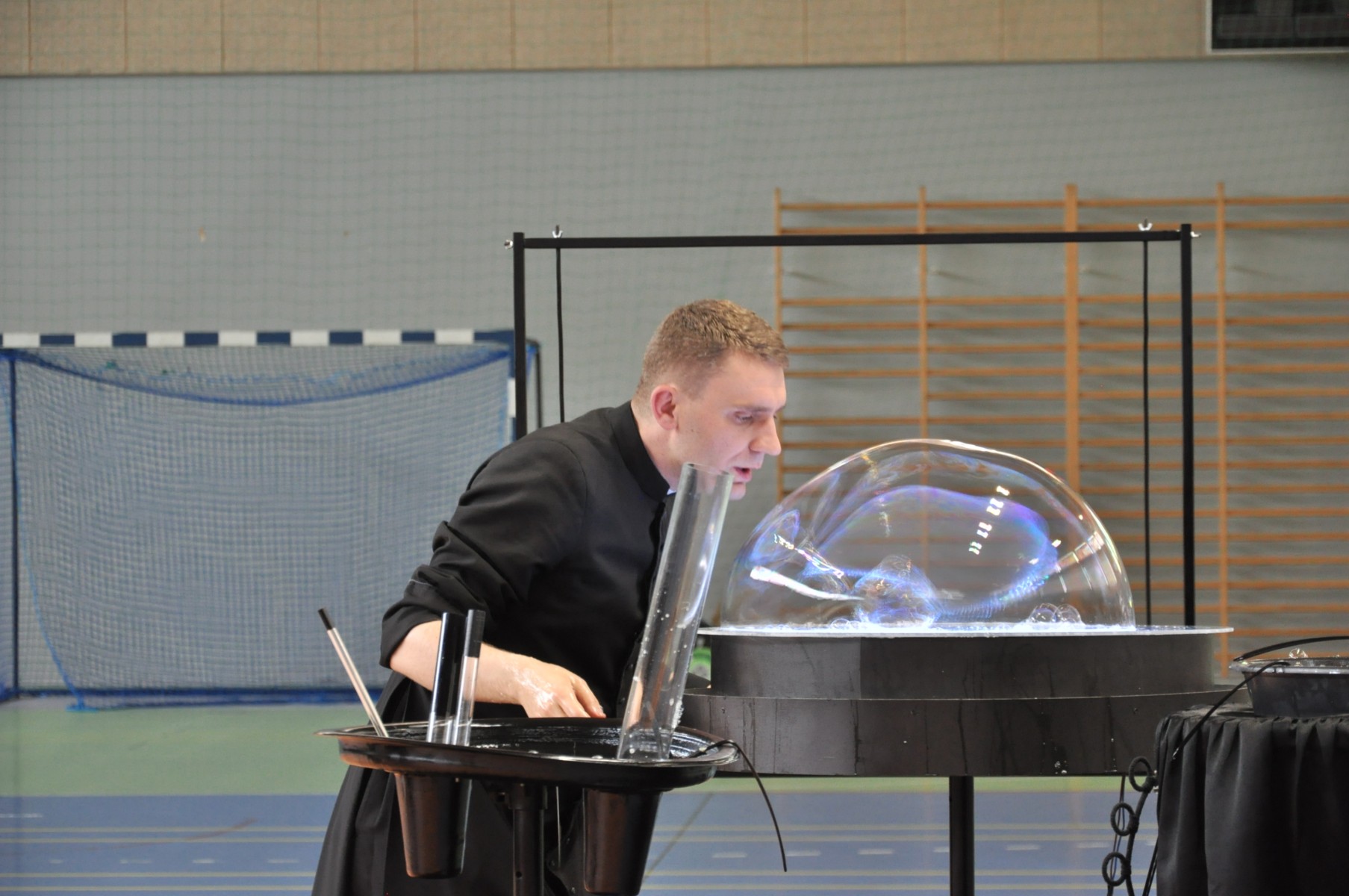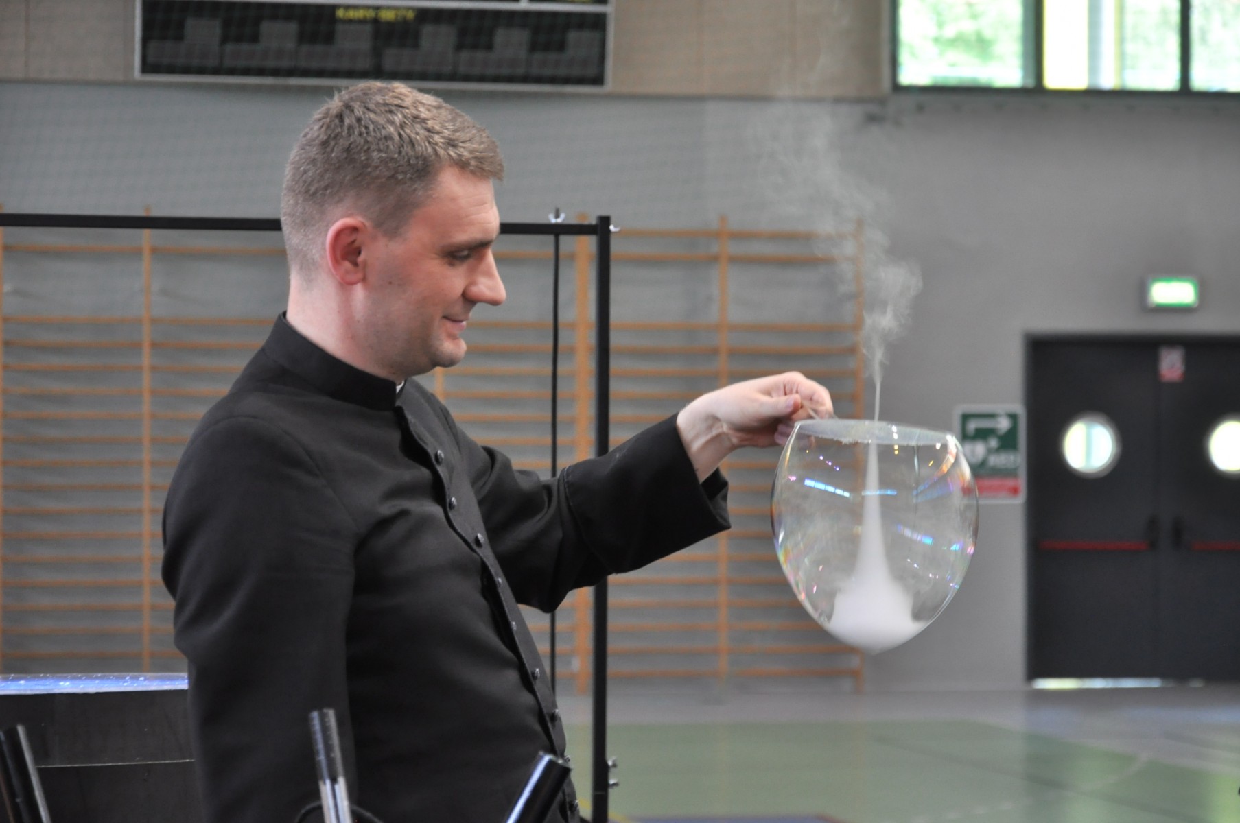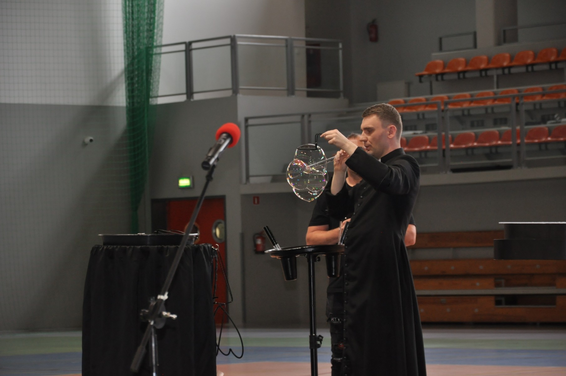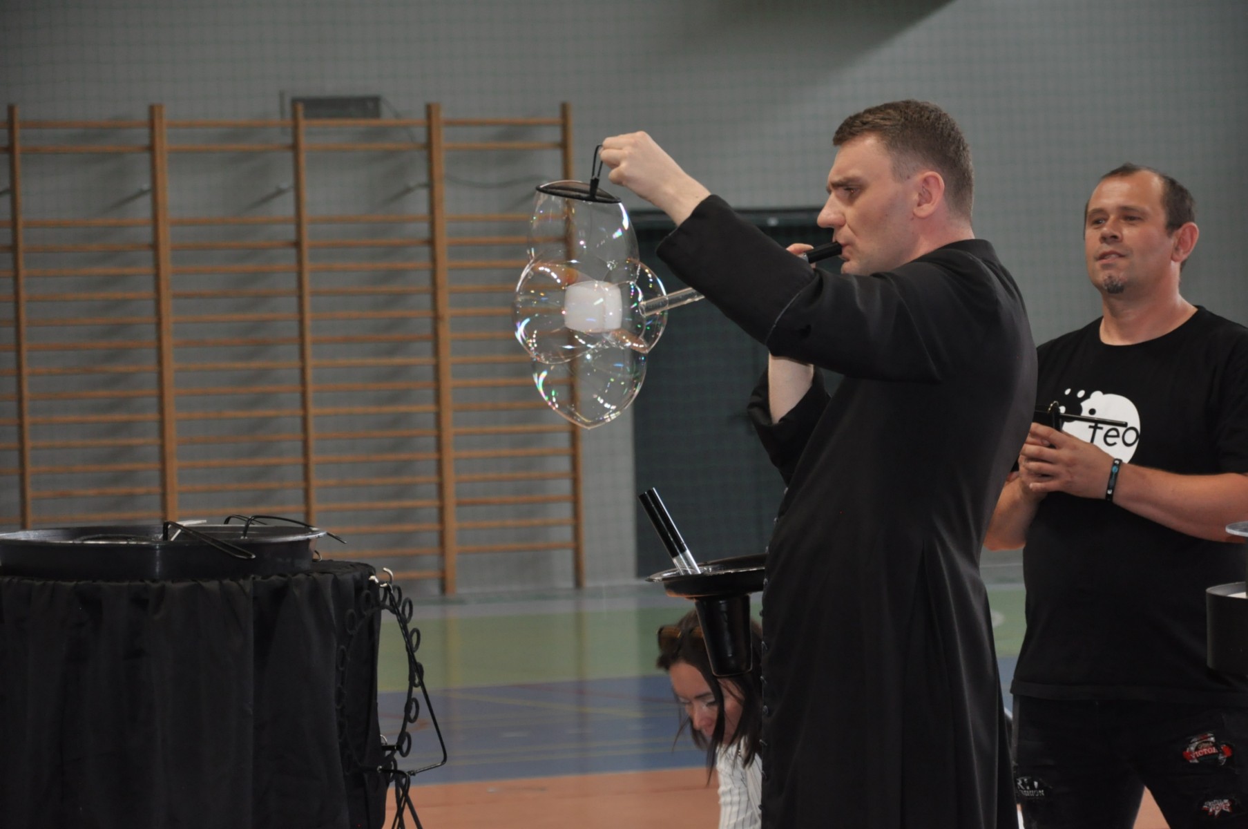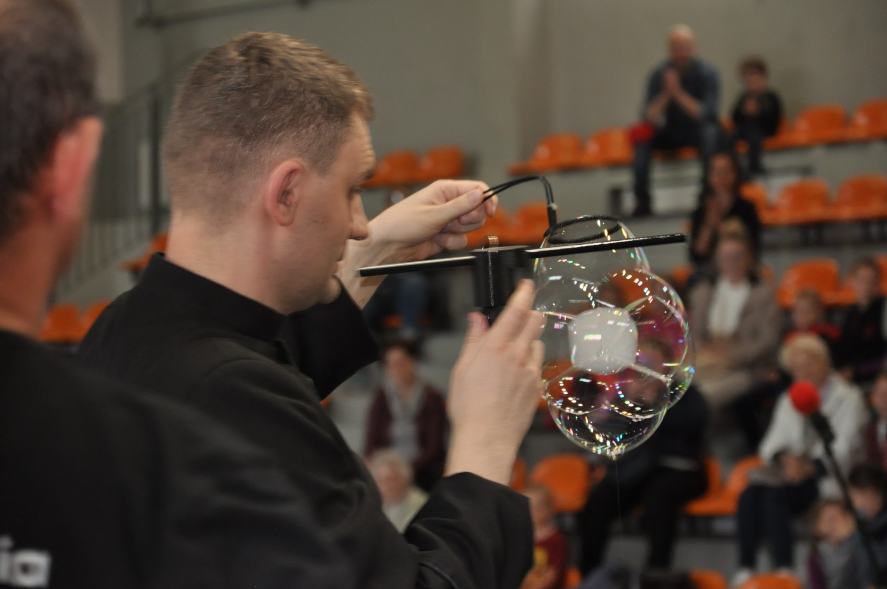 Ks. Teodor za pomocą nowoczesnych technik skupia wszystkich spragnionych bliskości z Bogiem w przestrzeni online. W sobotę wszyscy chętni mogli świętować z księdzem 5 urodziny Teobańkologii. Spotkanie tym razem na żywo odbyło się w hali sportowej Atola. Był pokaz baniek mydlanych w wykonaniu ks. Teodora. Dzieci i dorośli byli zachwyceni.