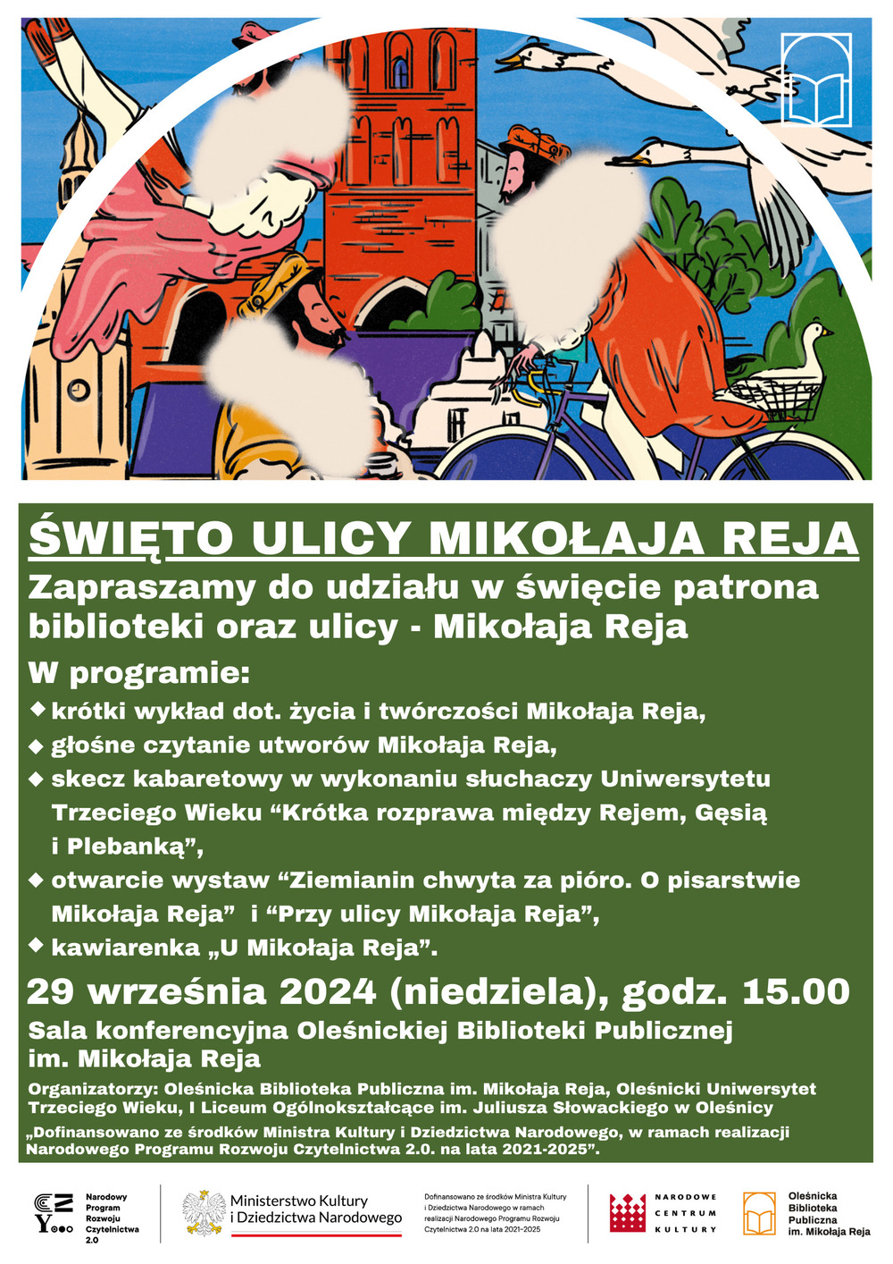 9 Września 2024Oleśnicka Biblioteka Publiczna im. Mikołaja Reja, wraz z partnerami, Oleśnickim Uniwersytetem Trzeciego Wieku oraz I Liceum Ogólnokształcącym im. Juliusza Słowackiego, zapraszają do wspólnych obchodów Święta Ulicy Mikołaja Reja! Będzie to doskonała okazja do poznania patrona ulicy trochę bliżej, a także do zgłębienia historii tej części Oleśnicy. Na ten dzień przewidziana jest moc atrakcji!