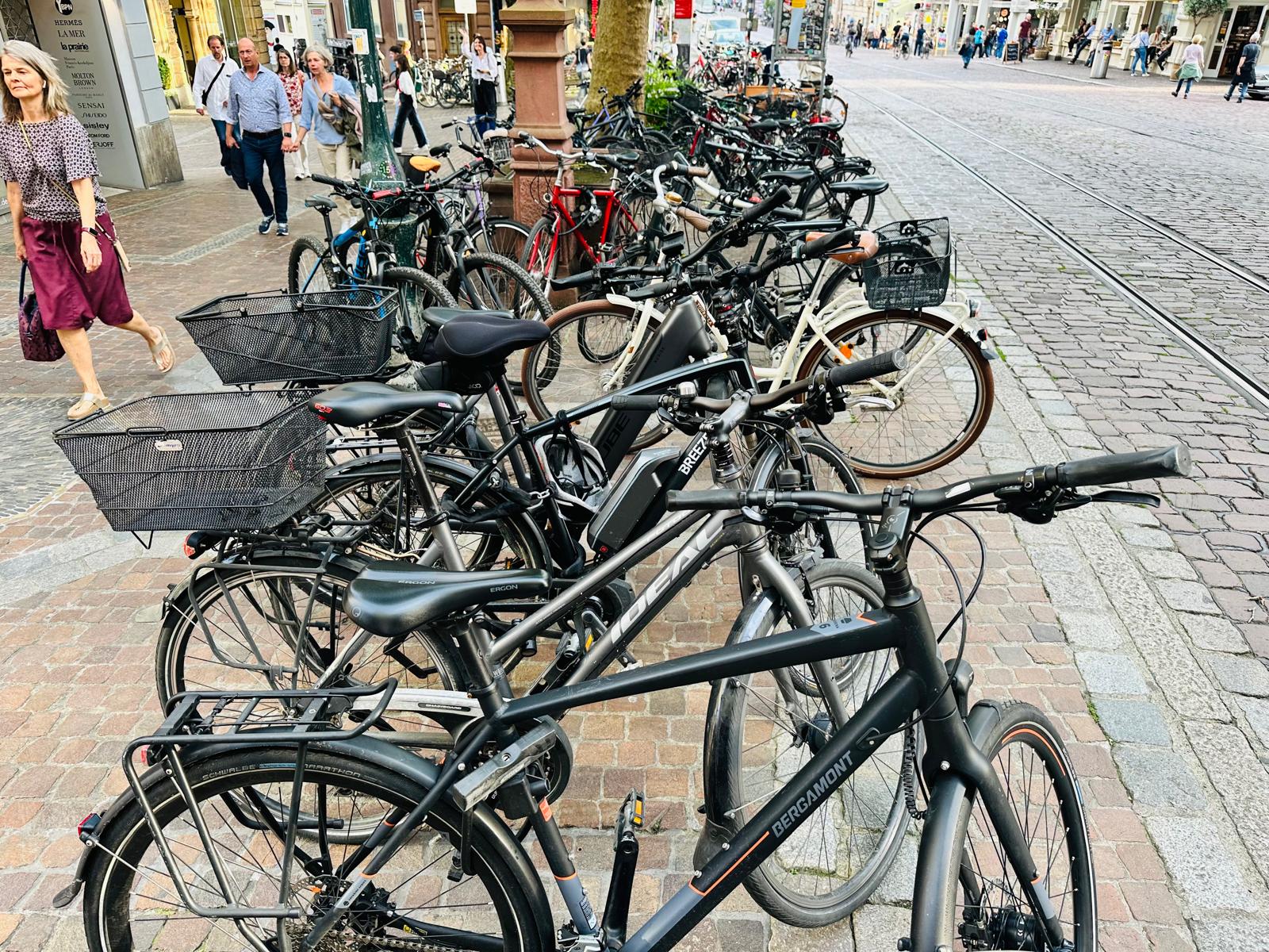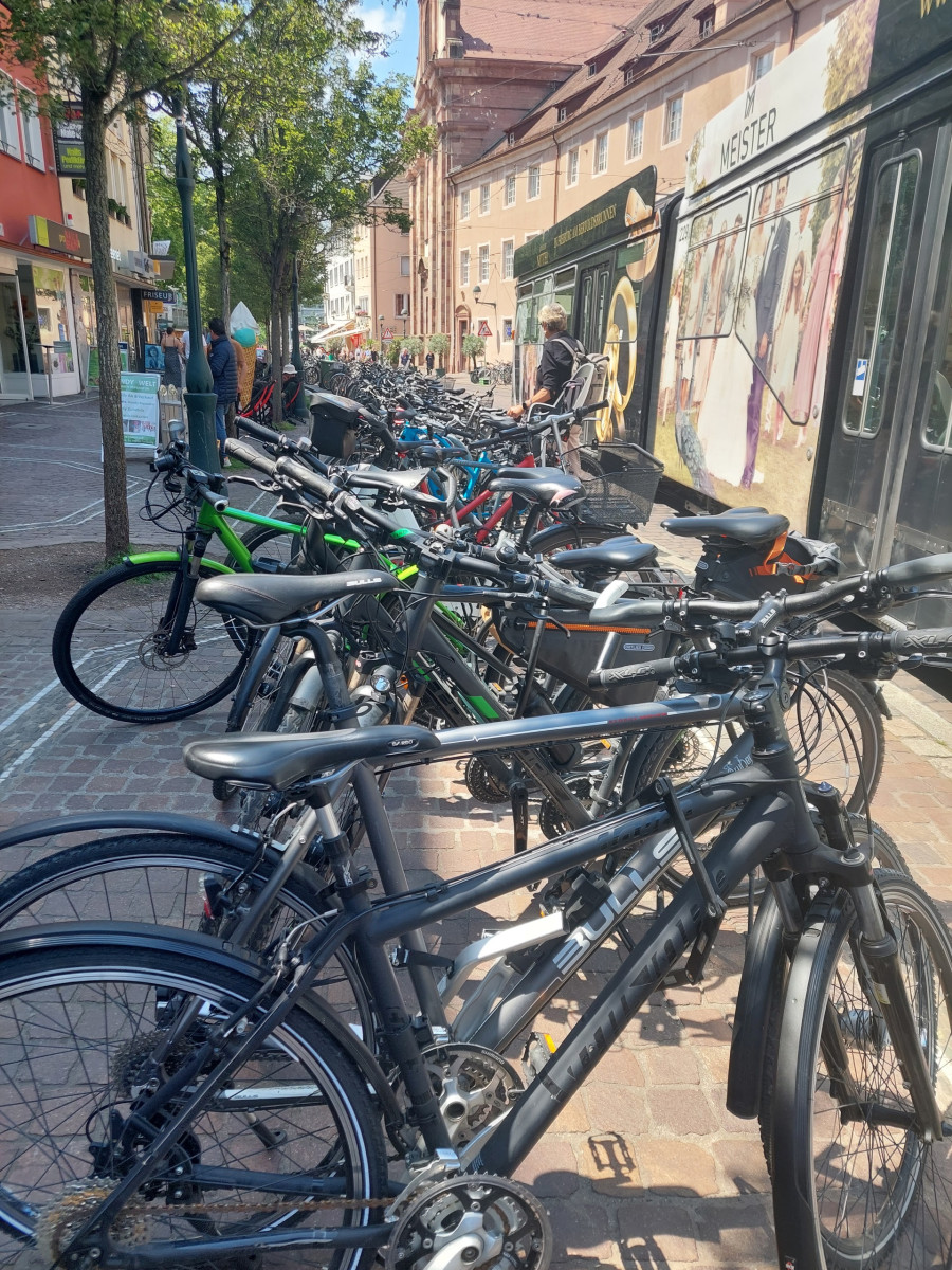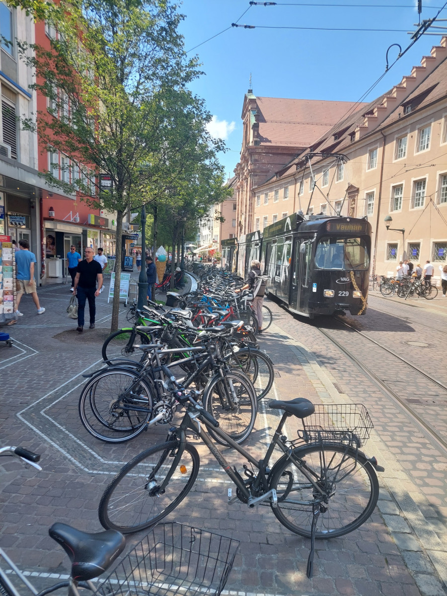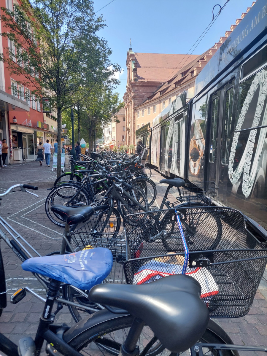 Dominującym środkiem transportu w Freiburgu jest rower. To miasto jest po prostu stworzone dla rowerów. Są one wszędzie. Przypięte do wszechobecnych stojaków przy chodnikach, kawiarniach, sklepach, instytucjach, a trasy rowerowe wokół miasta i w samym mieście to istne autostrady dla cyklistów. Infrastruktura drogowa została idealnie dostosowana do poruszania się jednośladami. Pierwszy raz widzieliśmy kilkupiętrowe parkingi ze stacjami dla rowerów. Zastosowane udogodnienia, takie jak zawężenia jezdni dla samochodów, ograniczenie na większości dróg prędkości jazdy do 30 km/h, strefy bez ruchu samochodowego, podwyższone opłaty za parkowanie samochodów w ścisłym centrum, arterie dla rowerów składające się z kilku pasów ruchu – zdecydowanie zachęcają do korzystania z jednośladów.