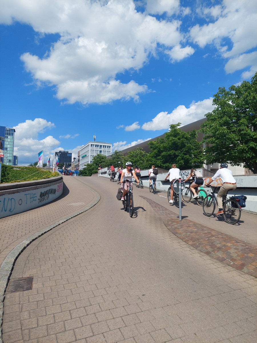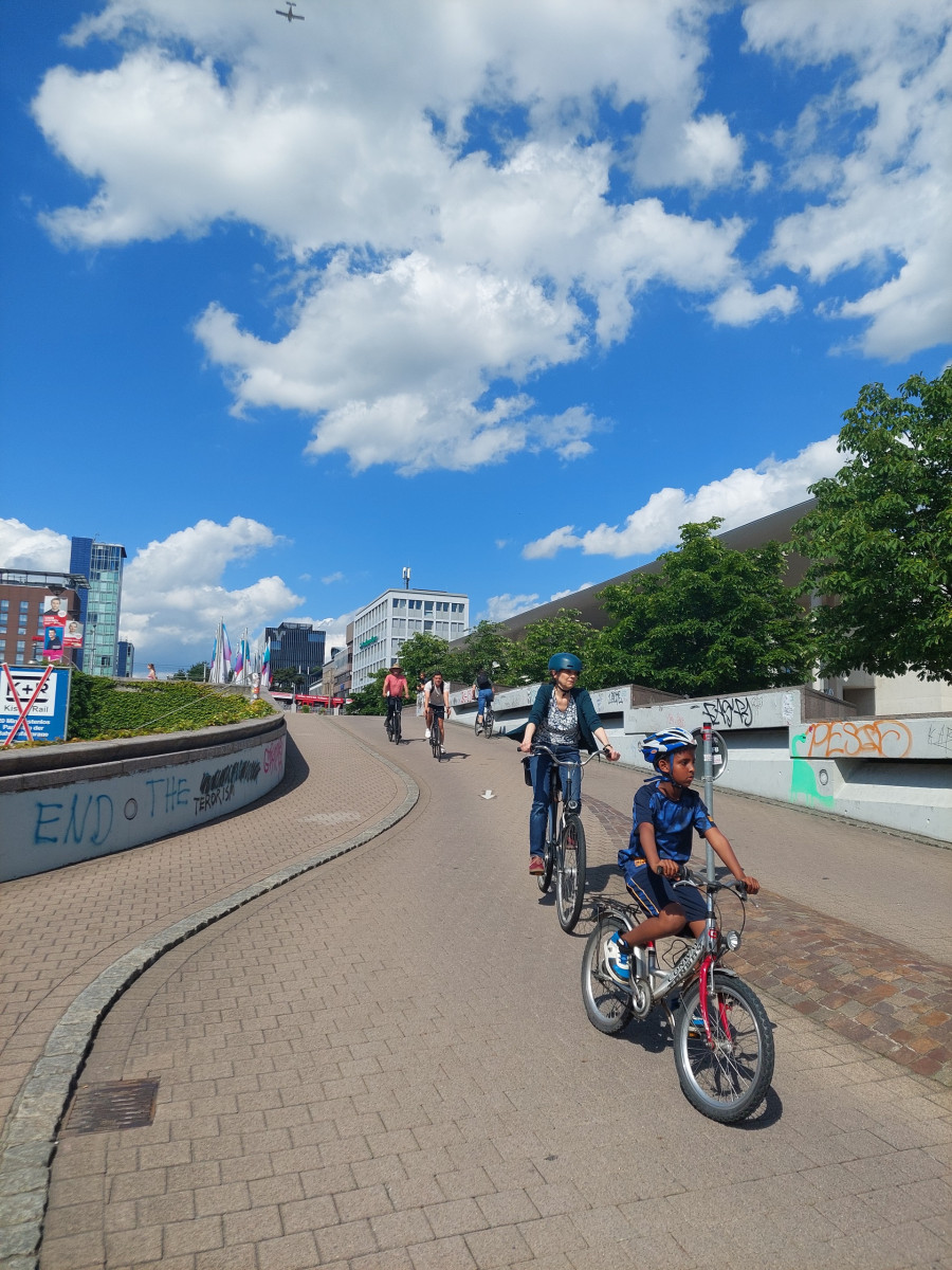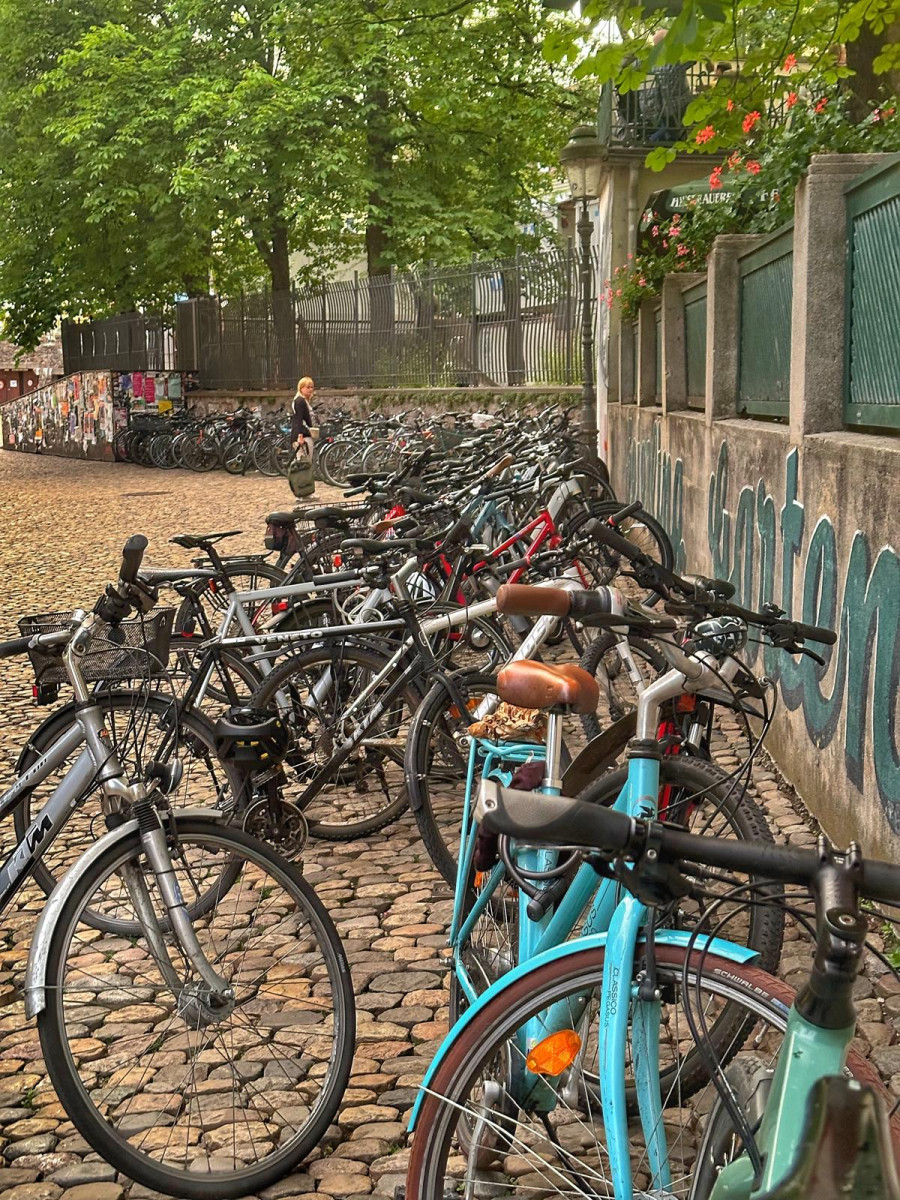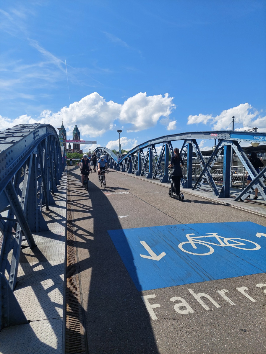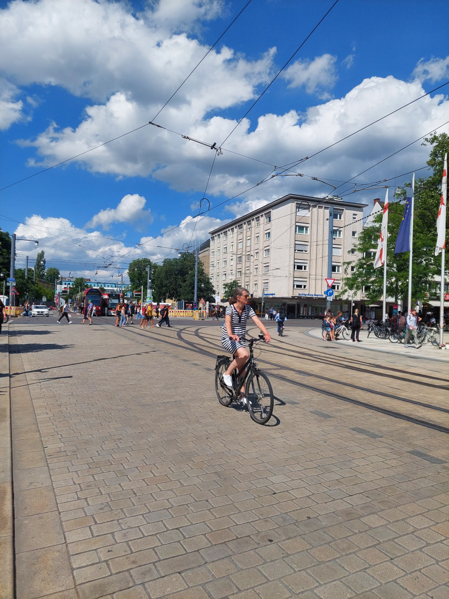 Dominującym środkiem transportu w Freiburgu jest rower. To miasto jest po prostu stworzone dla rowerów. Są one wszędzie. Przypięte do wszechobecnych stojaków przy chodnikach, kawiarniach, sklepach, instytucjach, a trasy rowerowe wokół miasta i w samym mieście to istne autostrady dla cyklistów. Infrastruktura drogowa została idealnie dostosowana do poruszania się jednośladami. Pierwszy raz widzieliśmy kilkupiętrowe parkingi ze stacjami dla rowerów. Zastosowane udogodnienia, takie jak zawężenia jezdni dla samochodów, ograniczenie na większości dróg prędkości jazdy do 30 km/h, strefy bez ruchu samochodowego, podwyższone opłaty za parkowanie samochodów w ścisłym centrum, arterie dla rowerów składające się z kilku pasów ruchu – zdecydowanie zachęcają do korzystania z jednośladów.