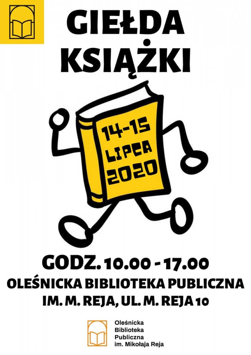 10 Lipca 2020Życząc Wam udanego weekendu raz jeszcze zapraszamy na GIEŁDĘ KSIĄŻKI, która odbędzie się 14 i 15 lipca 2020 r. w godzinach od 10.00 do 17.00 w Bibliotece w Oleśnicy.